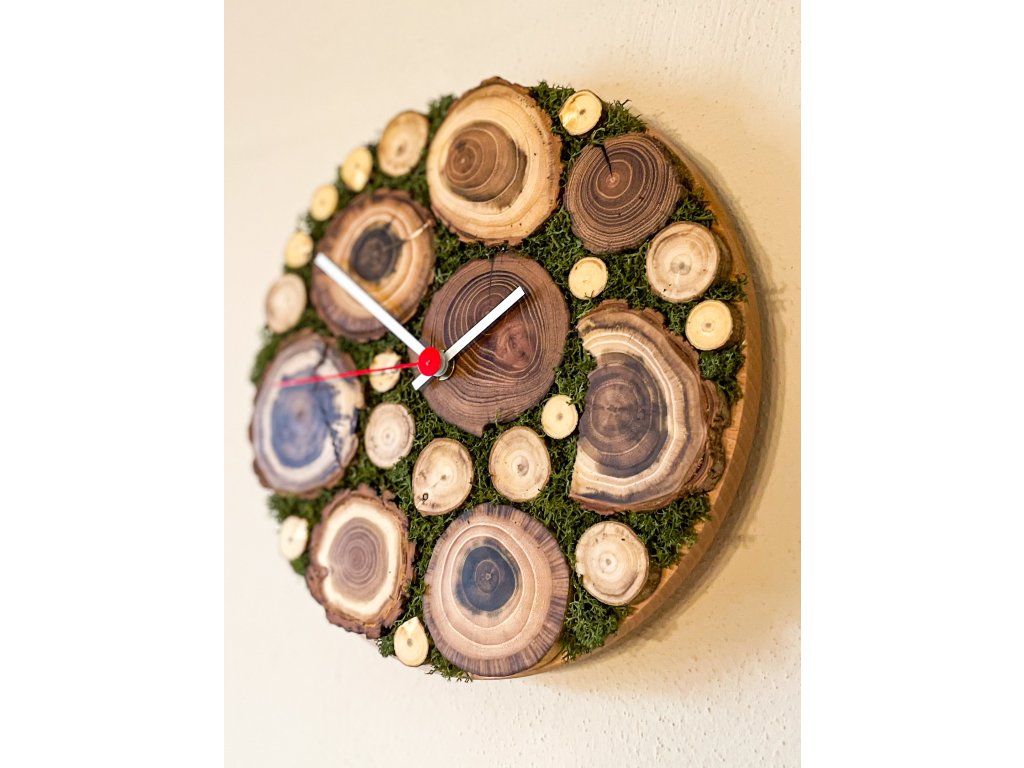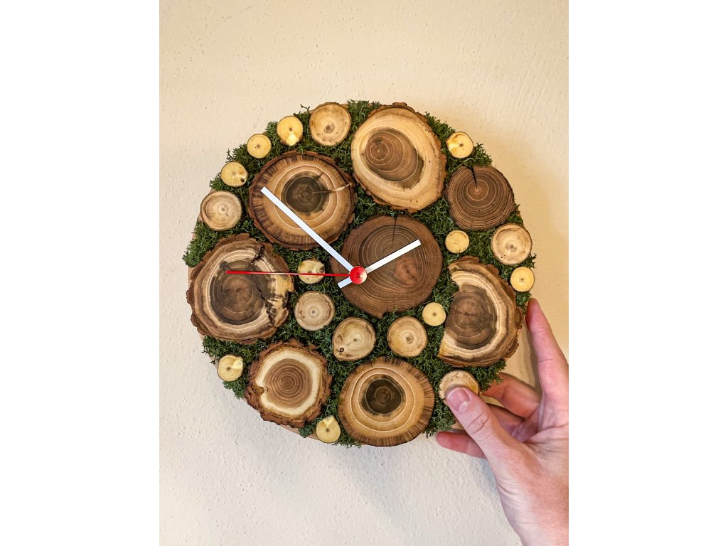 Originálne nástenné hodiny, ktoré spájajú prírodnú estetiku s kvalitným spracovaním. Základ tvorí pevná buková doska, na ktorú sú starostlivo osadené kolieska z agátového dreva rôzneho veku. Každé drevené koliesko je unikát – s vlastnou kresbou letokruhov a prirodzenou farebnosťou. Priestor medzi nimi vyplnený stabilizovaným machom dotvára celkový dojem lesného ticha a harmónie.