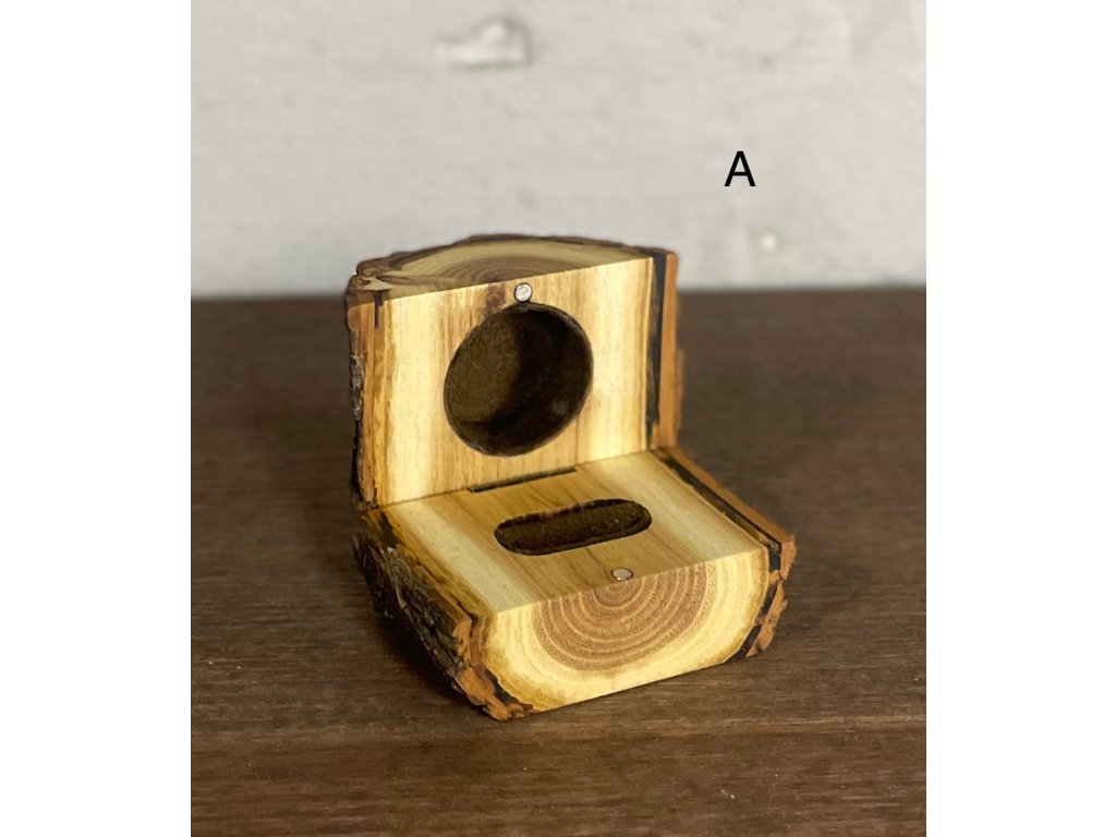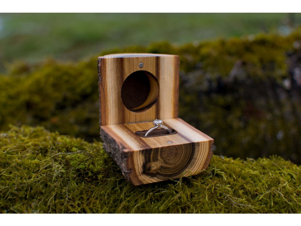 Krabička s prírodným vzhľadom určite prekvapí a poteší každú budúcu snúbenicu. Prstienok je uložený vo vydlabanej diere a o jeho pohodlie sa stará semiš. O bezpečné uzavretie prsteňa sa postarajú 2 malé nenápadné magnety a mosadzné pántiky.
